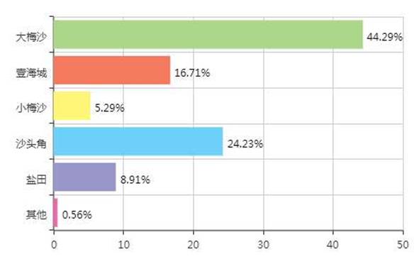 在想检查的片区中,44.29%的市民希望能检查大梅沙片区的餐馆,第二位是沙头角,第三位是壹海城。