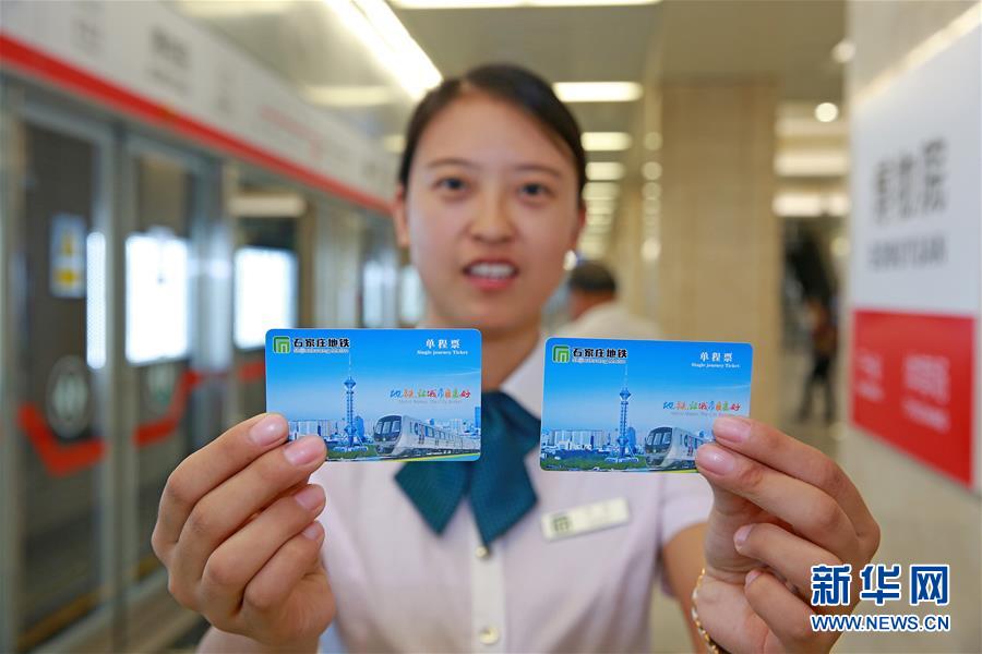 6月14日,石家庄地铁工作人员在1号线地铁站内展示车票。