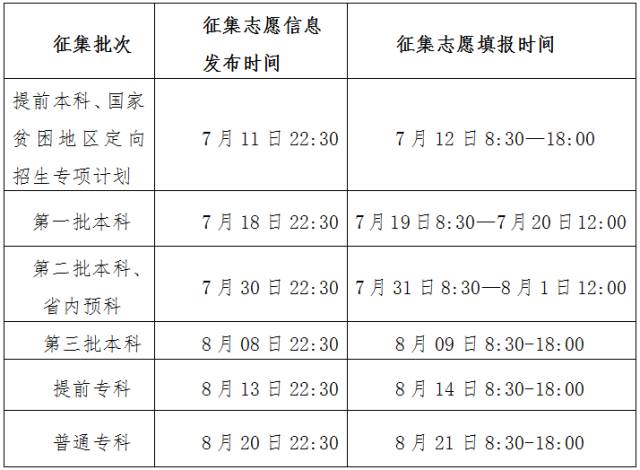 本科提前批次志愿填报截止时间:6月28日20点(北京时间);其他批次志愿填报截止时间:7月1日20点(北京时间)。
