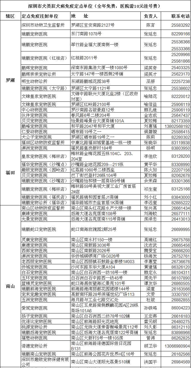 深圳市犬类狂犬病免疫定点单位: