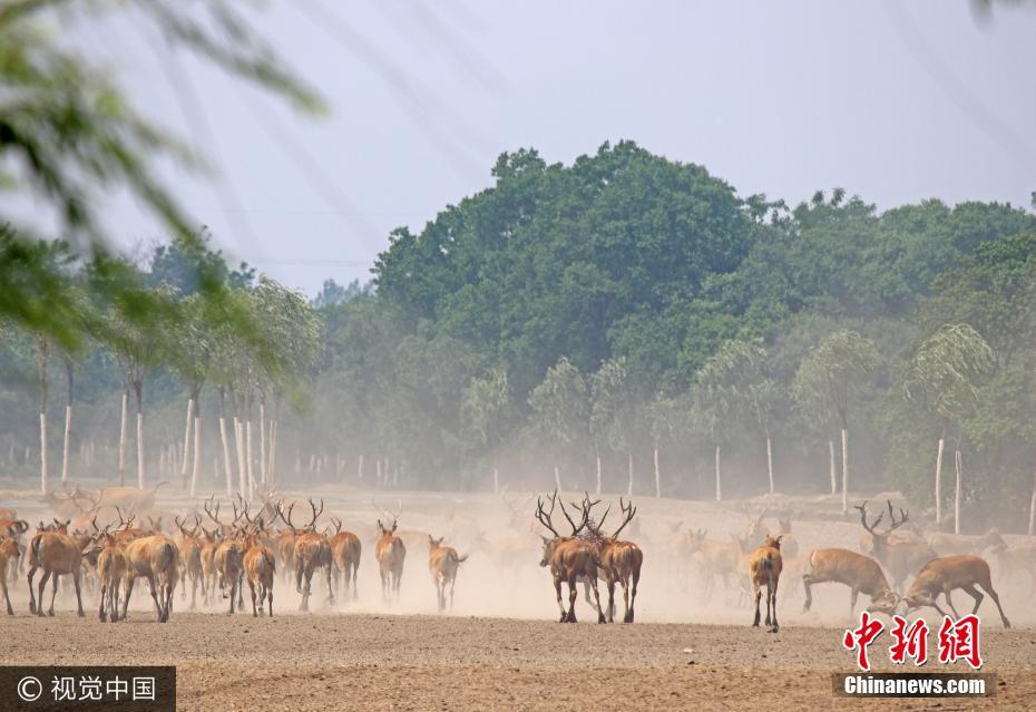 2017年6月18日,江苏大丰麋鹿国家级自然保护区,“鹿王争霸”融媒体现场直播,打斗场面令人震撼。当前,正是麋鹿发情交配季节。麋鹿是一夫多妻的群居动物,通过一对一淘汰对手,最后当上鹿王。图片来源:视觉中国