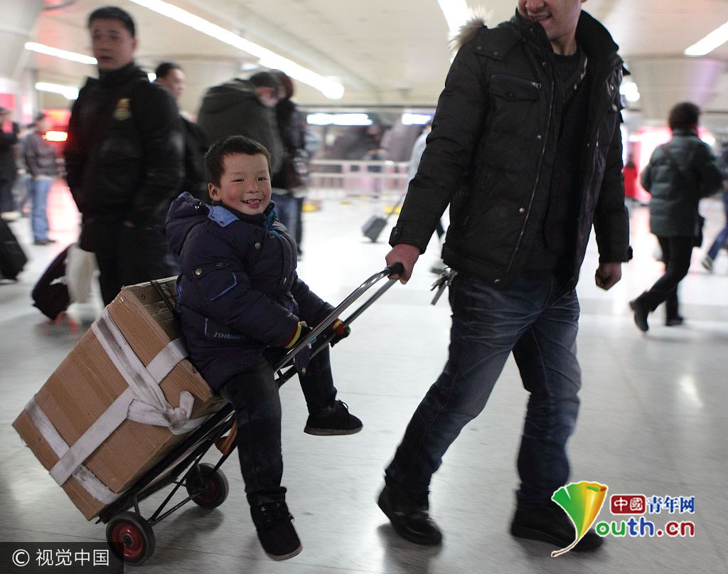 2012年2月2日,浙江省杭州市,在杭州城站火车站出口处,来自郑州的张铭宇坐在行李箱上,让爸爸拖着,显得很开心。爸爸在义乌工作,非常努力地赚钱,当年开始把儿子从老家带到身边。儿子从此不再留守老家,和爸妈一起生活在义乌,每天都很开心。