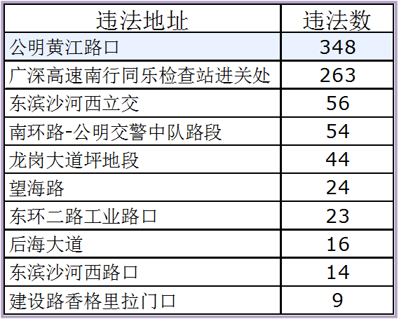 “黄方格”也称“网状线”,用以标示禁止以任何原因停车的区域,视需要划设于易发生临时停车造成堵塞的交叉路口、出入口及其他需要设置的位置,通常有网状线、简化网状线两种。据了解,2017年至今,全市共查处“黄方格违法”行为996宗,其中现场查处438宗,占总数的43.98%,非现场查处558宗,占56.02%;从违法车型看,其中小型汽车626宗,占比62.85%,大型汽车330宗,占比33.13%,香港出入境车36宗,占比3.61%,其他类型车辆4宗;从车辆登记所在地看:本市车588,占59.04%,外地车408,占40.96%。全市查处“黄方格违法”较多的区域为光明413宗,高速公路276宗,南山156宗。前十个违法地点具体为: