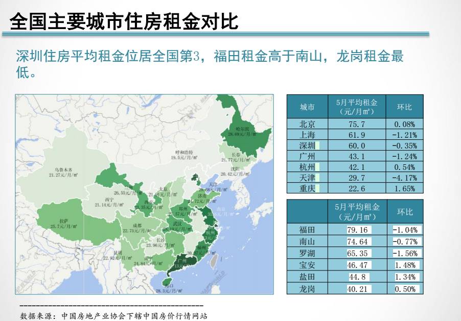 据中国房价行情网站数据,5月深圳平均月租为60元/平,环比下跌0.35%。其中,关内的福田、南山、罗湖的租金都在下跌,罗湖跌幅最大,环比降了1.56%。 相反,关外的宝安、盐田、龙岗的租金都在上涨,宝安以1.48%的涨幅领先。