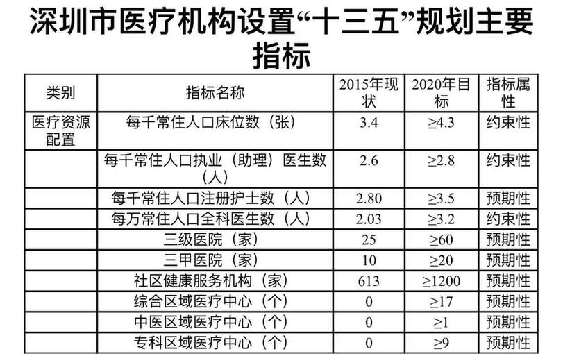 “十三五”期间,深圳将新建或改扩建60余家公立医院,其中新建成14家公立医院,使三级医院达60家以上,三甲医院达到20家;新增床位2.5万张以上,可供应床位达到6.4万张,常住人口千人床位数从2015年的3.4张增加到4.3张。