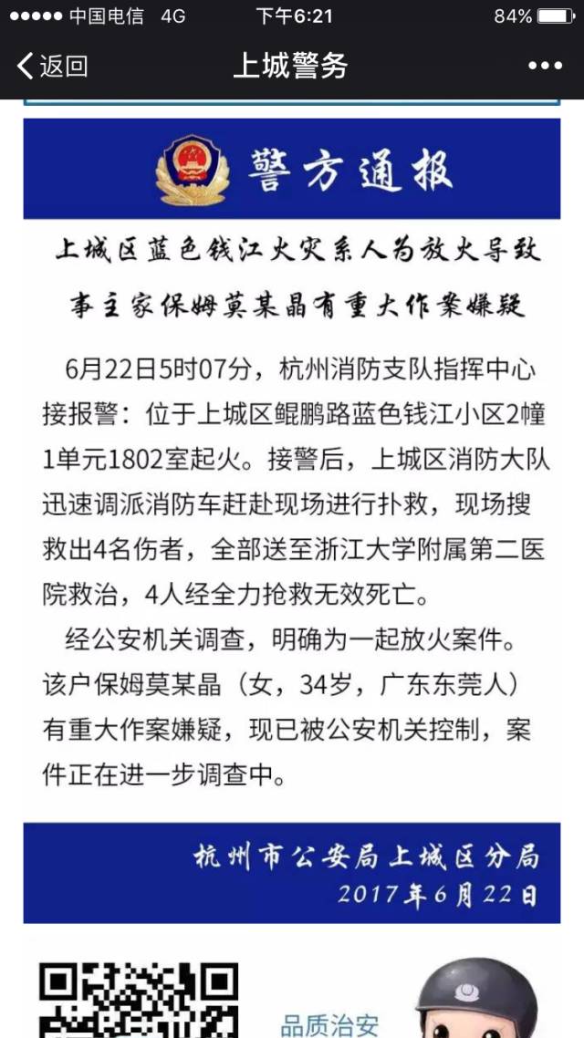 【上城区蓝色钱江火灾系人为放火导致 事主家保姆莫某晶有重大作案嫌疑】#关于“6.22”蓝色钱江火情的案情通报# 6月22日5时07分,杭州消防支队指挥中心接报警:位于上城区鲲鹏路蓝色钱江小区2幢1单元1802室起火。接警后,上城区消防大队迅速调派消防车赶赴现场进行扑救, 现场搜救出4名伤者,全部送至浙江大学附属第二医院救治,4人经全力抢救无效死亡。