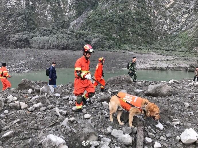 2017年6月24日6时许,四川茂县叠溪镇新磨村突发山体高位垮塌。6月25日早上6点半左右,按四川省消防总队安排,德阳消防救援队伍向救援区域进发。搜救队经过一个多小时徒步,于7点半左右全面投入搜救。因现场情况复杂,搜救强度大,搜救犬“小虎”很快累瘫。