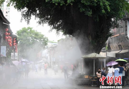 6月25日,福州三坊七巷启动喷水雾装置,为景区降温。 张斌 摄