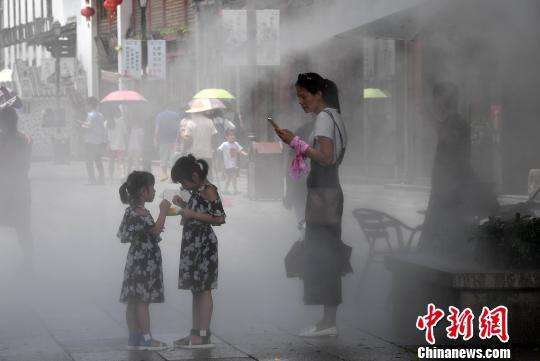6月25日,福州市民在三坊七巷喷水雾装置下纳凉。 张斌 摄