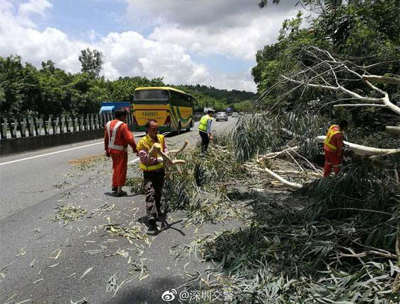 时逢周末出行高峰,深圳东部高速交警巡逻时发现后,一边疏导交通,一边协调相关部门进行清理,快速排除了安全隐患。