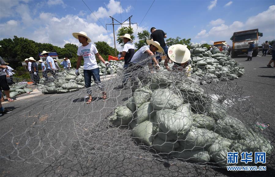 7月3日,抢险人员将沙袋用铁丝网包裹好准备封堵涵洞。