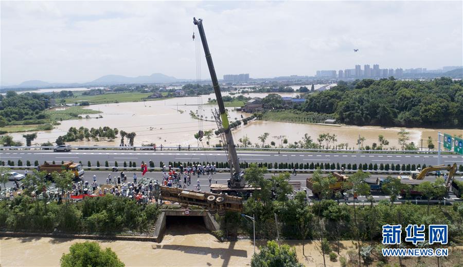 湘江支流现溃口 救灾队伍用挂车堵涵洞口