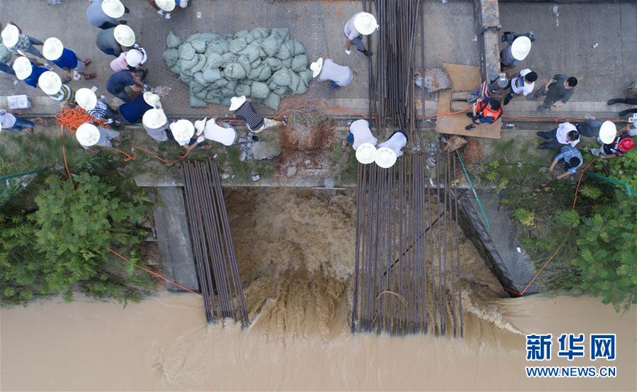 湘江支流现溃口 救灾队伍用挂车堵涵洞口