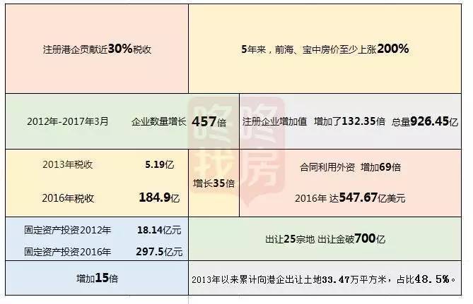 从完成填海的2012年到2017年一季度,前海企业数量增长了457倍,总量达11.67万家;注册企业增加值增加了132.35倍,达926.45亿元。前海开发开放实现了跨越式发展,已成为我国发展最快、效益最好的区域之一。