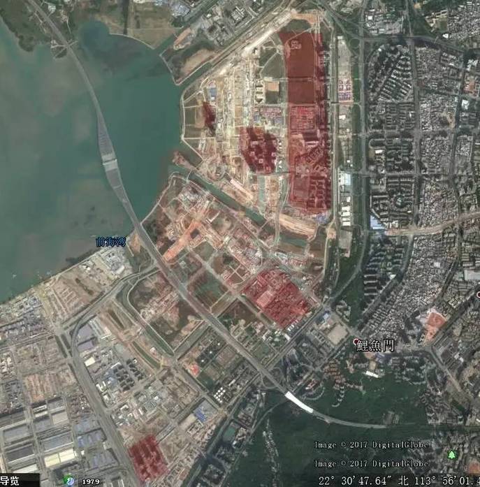 Google Earth显示的2017年3月份前海片区,很明显,道路网络雏形已现,轨道交通、公交设施、地下空间等为核心的市政基础设施建设全面铺开……