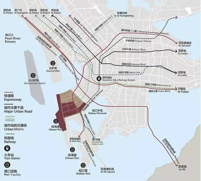 前海的规划各类轨道线路有12条,总长度约53公里,轨道网络密度3.5公里/平方公里。正在建设的有地铁5号线南延线、9号线西延线,预计最快2019年通车运营。