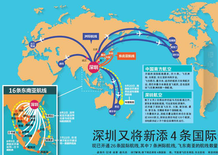 还开通了深圳直飞东京、大阪、新加坡、曼谷、普吉岛、吉隆坡等多个国际航线。