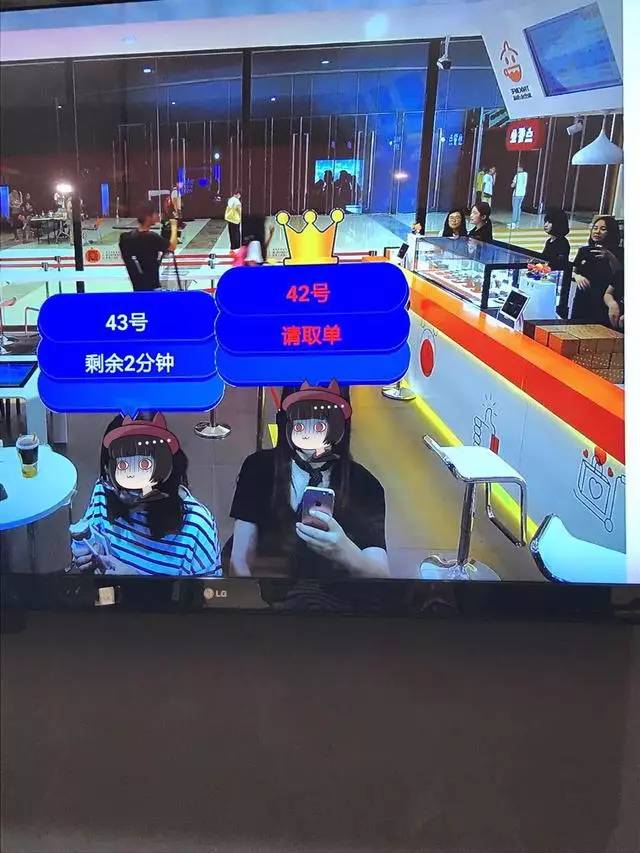 (大屏上,每位客人的等待时间会出现在头顶。)