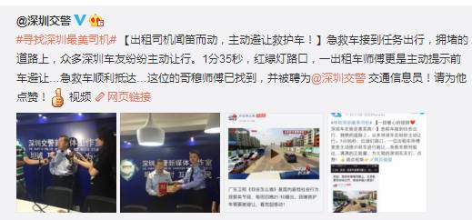 2015年11月19日,在广东卫视一档社会行为观察类节目《你会怎么做》播出的一期节目里,众多私家车纷纷为急救车让行,直到行驶到南山区南新路南头街路口时,路口信号灯为红灯。急救车在最左侧车道,前方有一辆出租车和私家车堵住了去路。急救车停下几秒后, 车牌为粤B3CP62的出租车驾驶门开了,该车司机不断向前车挥动右手。又过了几秒,路口信号灯变为绿灯,私家车前行调头,出租车则驶入路口靠左侧避让急救车。最终,急救车顺利到达目的地。