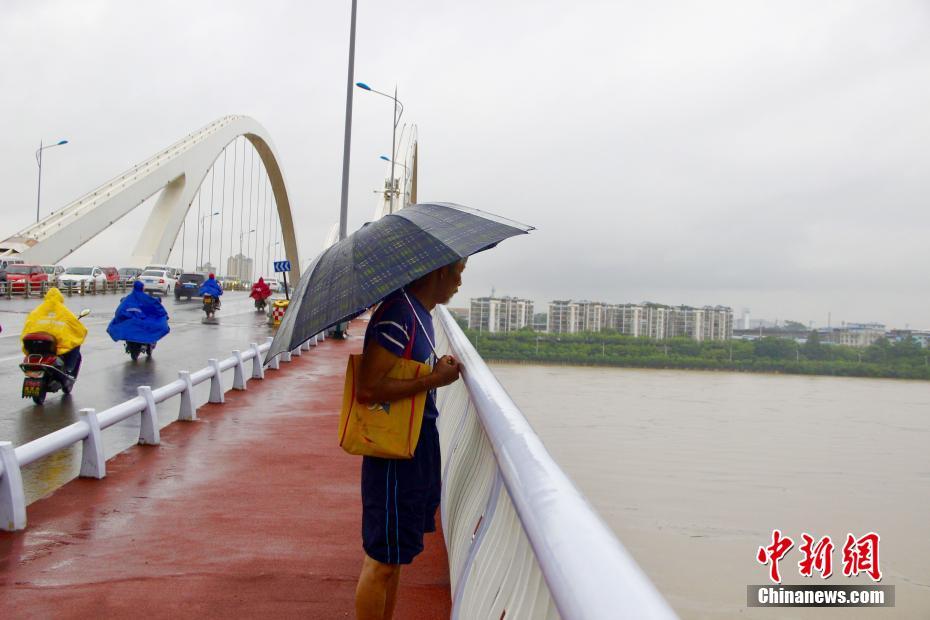 一位民众撑伞在岸边看洪水。朱柳融 摄