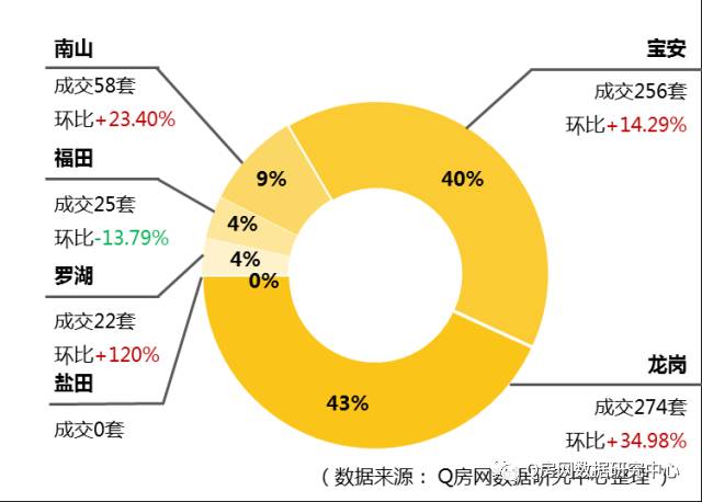Q房网数据研究中心数据显示,新房方面,龙岗赶超宝安重回全市成交第一大区,一周内共成交274套,占据了43%的成交量;其次是宝安区,成交256套,占全市总量的40%; 盐田区依然零成交。