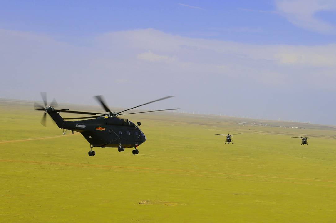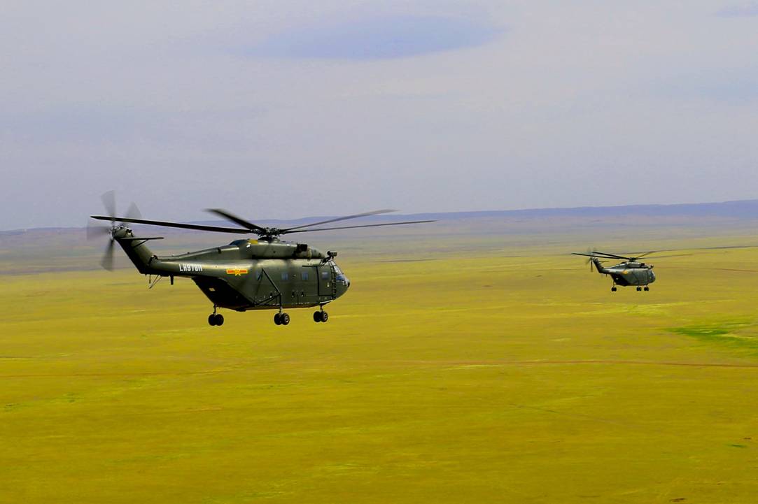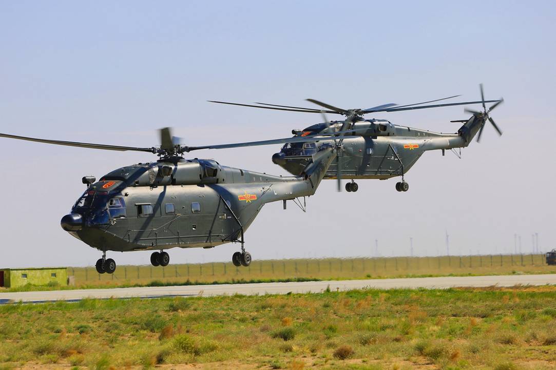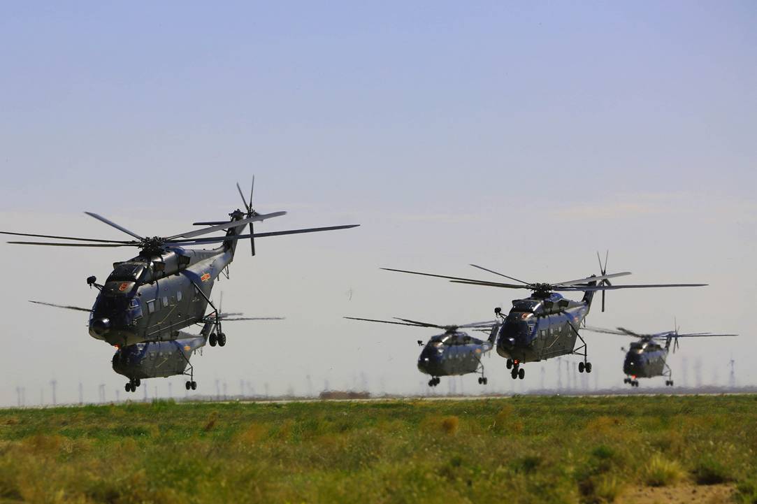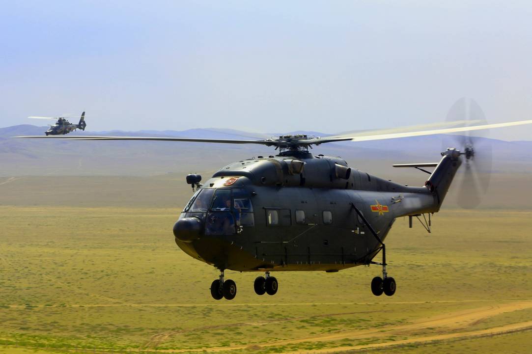 陆军航空兵部队的直-8运输直升机在中国北方进行综合训练。