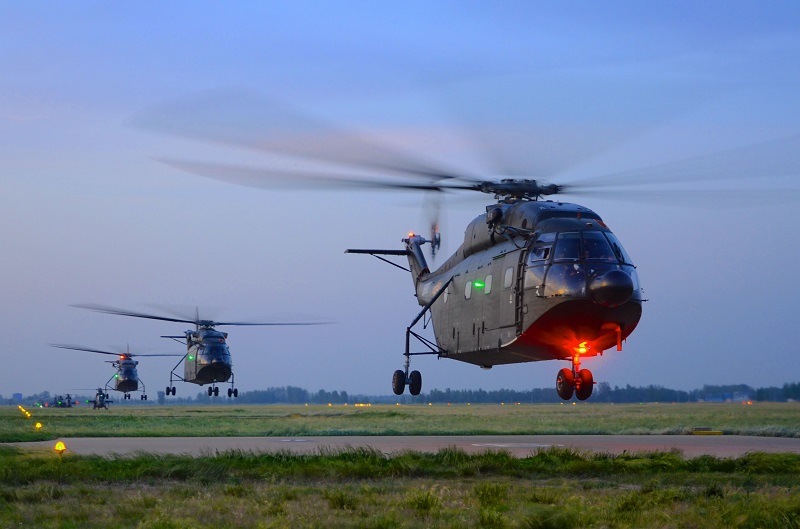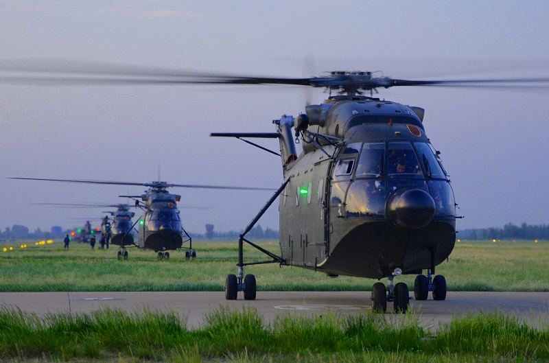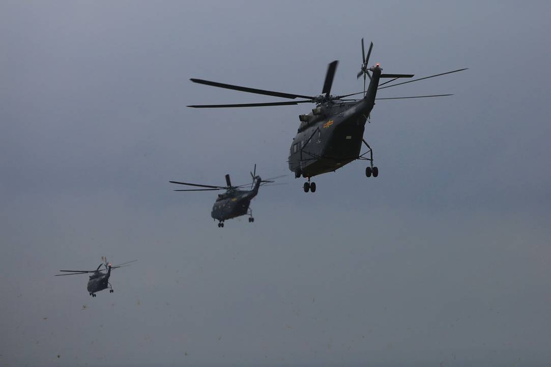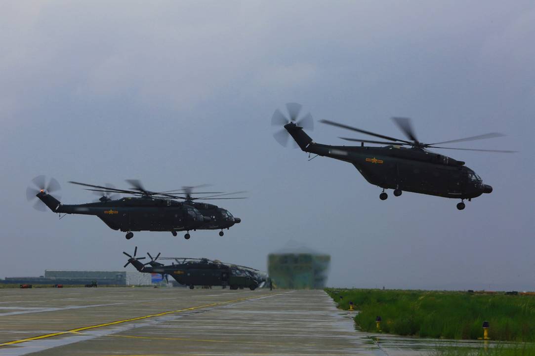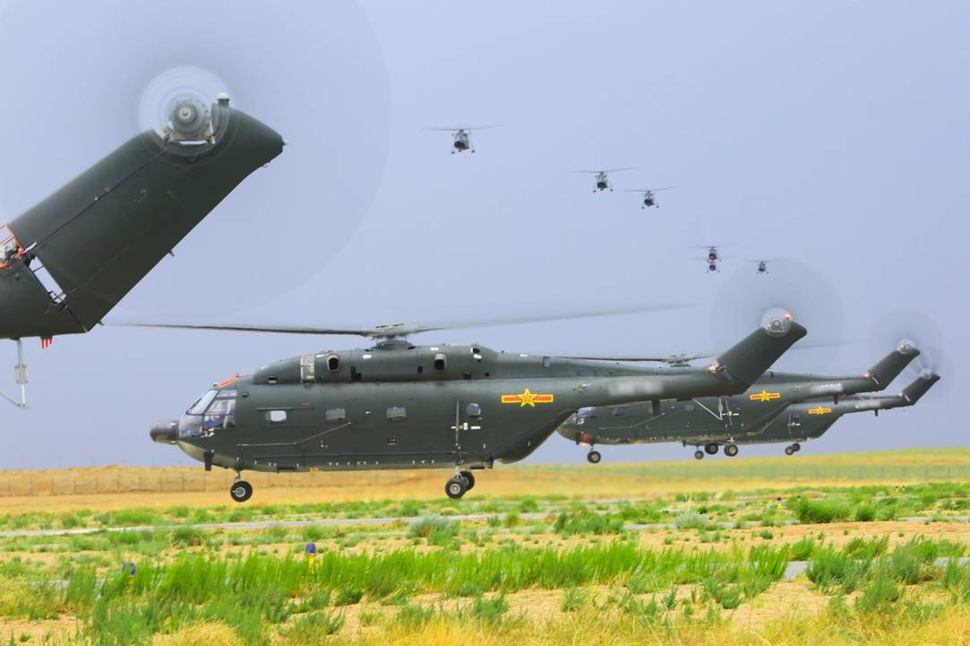 陆军航空兵部队的直-8运输直升机在中国北方进行综合训练。