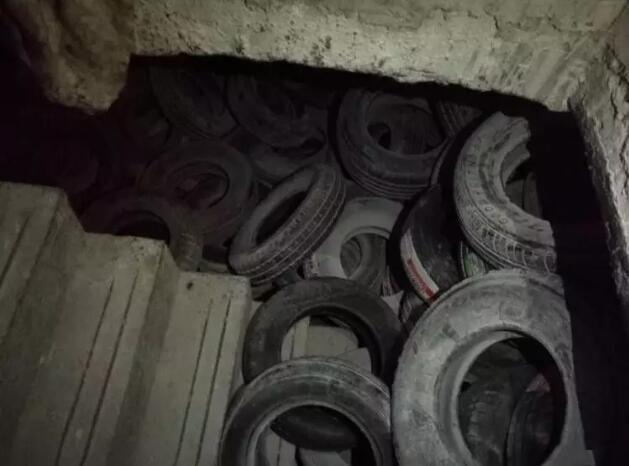 通过小区“老主顾轮胎店”内一个狭窄的楼梯口,记者低头弯腰进入地下室。在入口附近,堆放着大量轮胎,内部灯光昏暗,空气不畅,十分闷热。