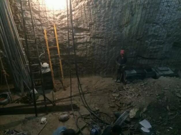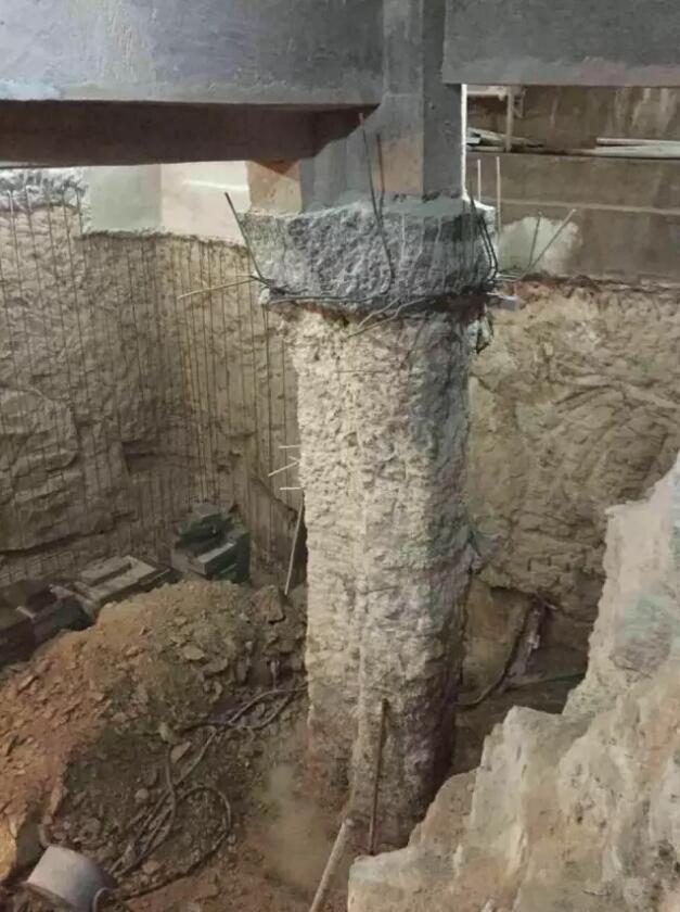 再往里走,可以看到,地下室被挖至约7米深,数百平方米,底部有积水,数根承重柱的结构发生改变,其中有2根遭到严重破坏,钢筋裸露在外。