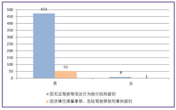 因无证驾驶等违法行为被行政拘留的共有481人,按性别分:男473人,女8人,按文化程度分:研究生2人,大学本科5人,大学专科18人,高中44人,中专或中技16人,初中304人,小学37人,文盲或其他55人。