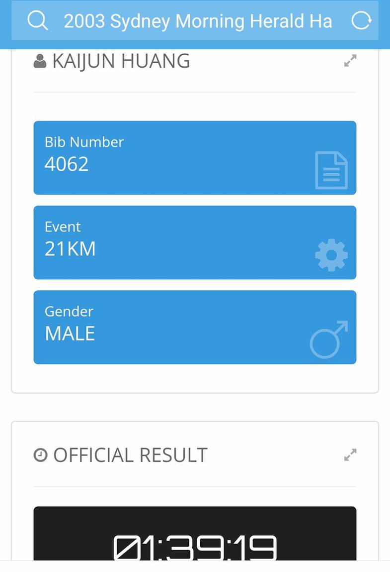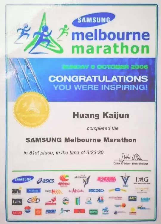 2003年,黄开军完成了人生中第一个半程马拉松,“也是在悉尼举办的一个半马赛,我的完赛成绩是1小时39分,在所有选手中的排名应该在前10%。”这项悉尼半马赛,黄开军连续五年都参加,成绩稳定在1小时40分左右。