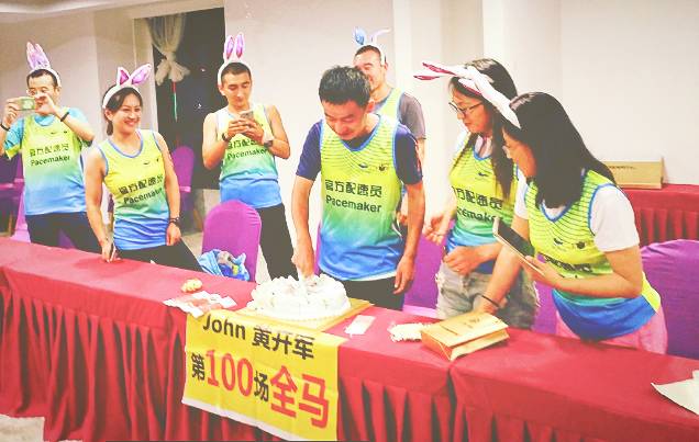 终于,在2017年6月11日山东的荣成滨海国际马拉松上,黄开军以官方配速员的身份,完成了自己的第100场全马赛事!组委会还贴心地给他安排了A0100的参赛号码布。