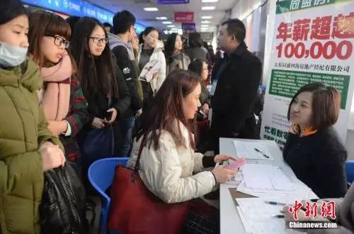 资料图:2016年2月15日,山西太原,春节后首场高校毕业生招聘会开场,图为众多求职者被一家公司的高薪待遇吸引。韦亮摄