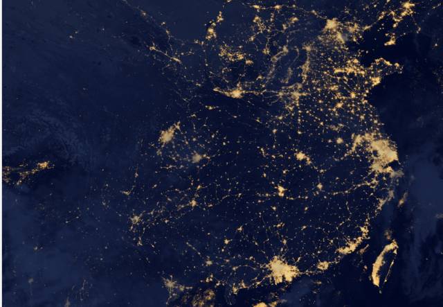 从这份全国夜晚灯光图中不难看出,灯光亮度基本符合“黑河-腾冲”的胡焕庸线分布。胡焕庸线以东,以43%的国土面积,集中了全国93%的人口和95%的GDP。