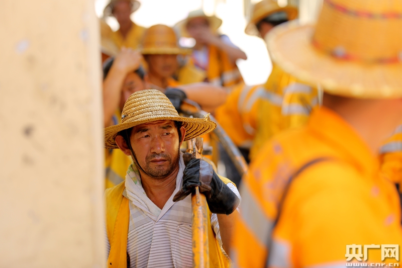高温下两个小时的忙碌,每位工人都汗流浃背。