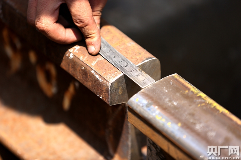 焊轨工在对更换后的钢轨进行测量。他们说,换钢轨的误差意味着旅客的生命安全。