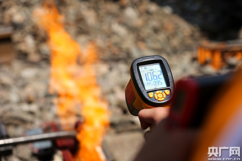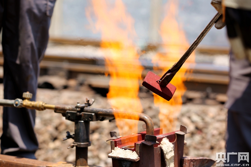 温度计显示,焊枪喷射的火焰内焰温度达到1062℃。此时的焊轨工要在40℃的高温下穿着厚重的防护服守在这个“火炉”旁边。