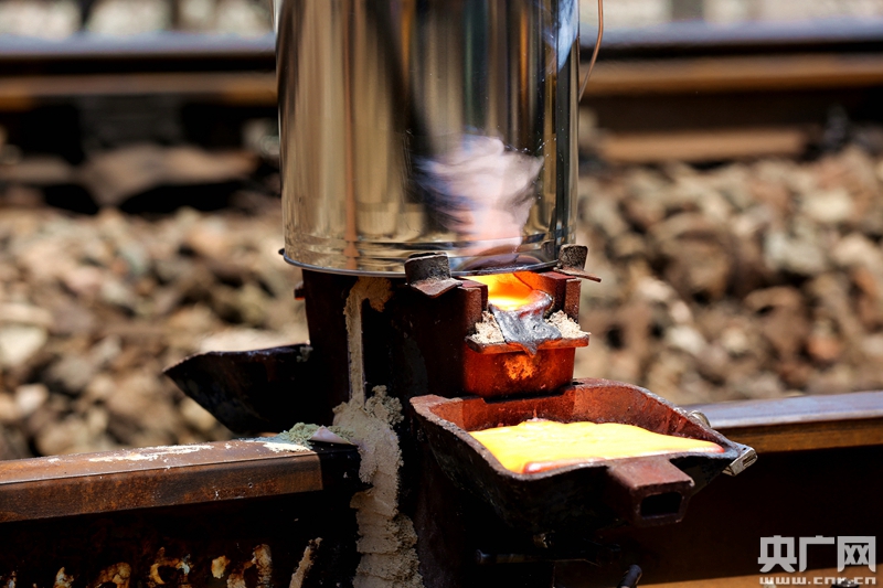 就像骨科医生给病人接骨一样,焊轨工们也要给铁轨进行“接骨”。两段钢轨的接缝处被安装上一个”砂锅“,相当于打了一个“绷带”,然后有人用高温火柴点燃焊剂,焊剂在高温的作用下溶解并流出封箱,两根钢轨融为一根。镁条燃烧发出耀眼的光,轨温瞬间达到了2000-3000℃。