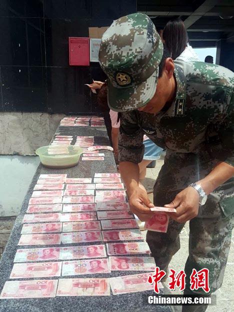 7月16日早,驻吉某部官兵600余人前往吉林省吉林市永吉县口前镇,进行灾后清淤工作。连长姚金厚在火车道附近清淤时,整理出一袋用纸袋包裹着的现金。纸袋已经破损,现金裸露在淤泥中。在附近群众的帮助下,官兵们将被淤泥浸泡的现金用清水冲洗干净,并晾晒、清点。经清点,共有三万多现金,已全部转交给当地抗洪指挥部。苍雁 摄