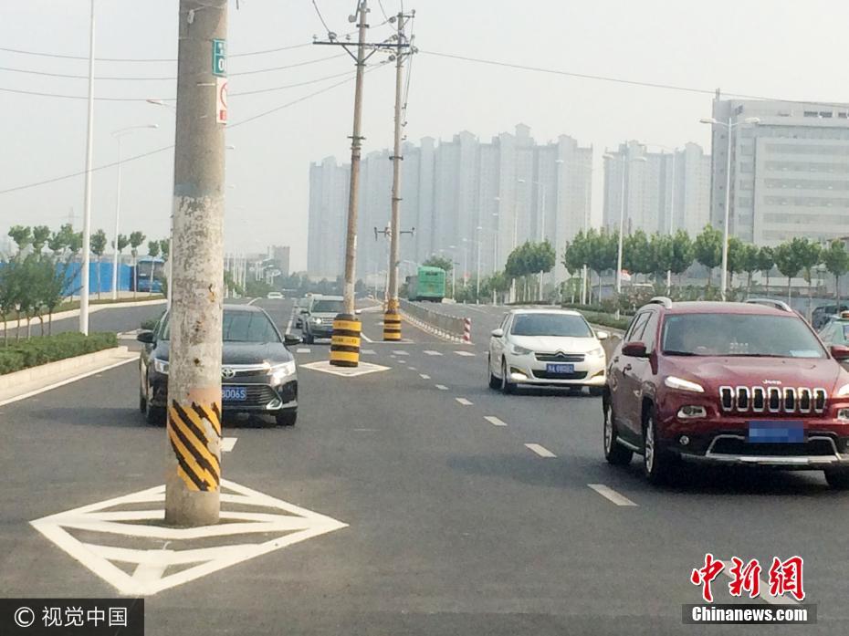 2017年7月15日,河南郑州,有司机不断反映,桐柏路(航海路至长江路)一段新修的道路上,矗立着8根电线杆,将由南向北的三个机动车道全部占满,在这里开车,如同过“梅花桩”。据附近居民介绍,这条路修的时候,电线杆就没有移走,每次经过这里,都感觉非常危险,总得小心翼翼。图片来源:视觉中国