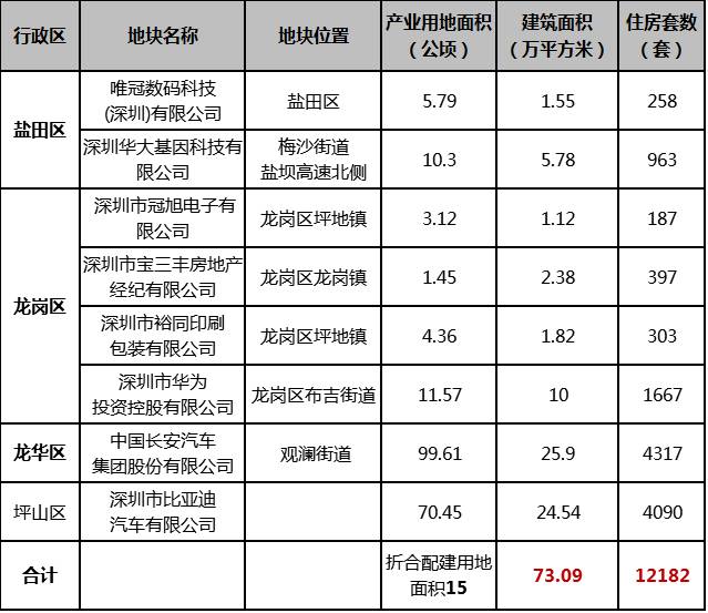 据了解,这些企业主要集中在高科技、生命科学、新能源、IT通讯类等新兴产业。从表格中也可发现,主要是在分配产业用地的基础上,政府配建了一定比例的保障房。其中两大汽车公司面积最大,配建的保障房数量也最多:长安汽车4317套、比亚迪4090套。