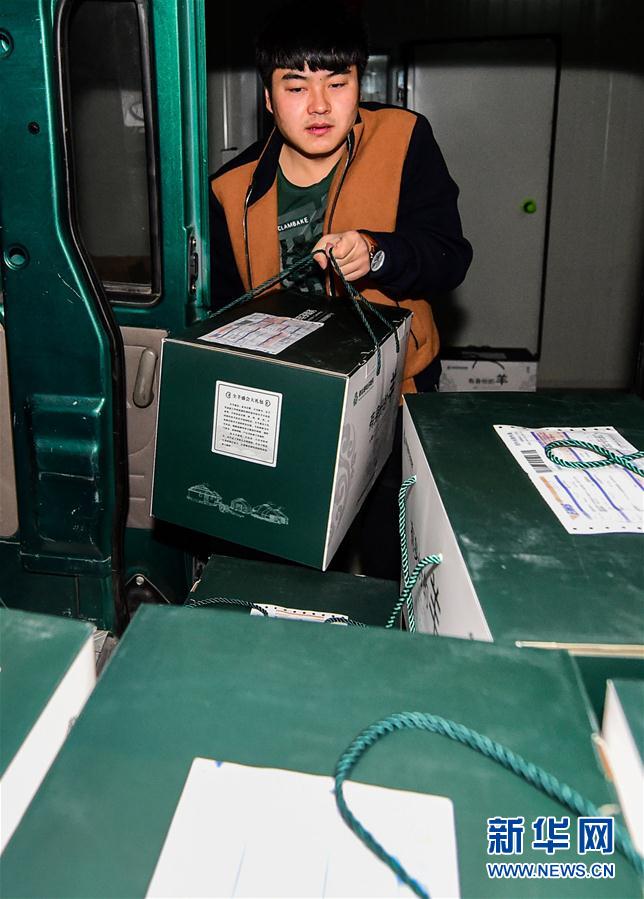 内蒙古锡林浩特市一电子商务平台的工作人员通过快递向外地客商发送牛羊肉(2017年1月12日摄)。