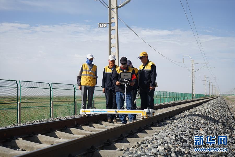 青藏铁路公司格尔木工务段检修组工作人员在加尔苏至格尔木区间作业(7月7日摄)。