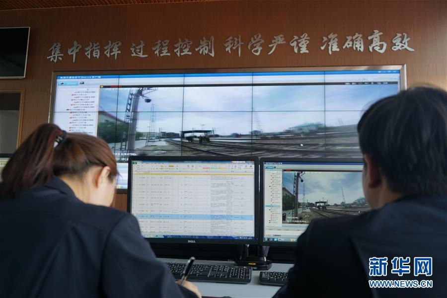格尔木工务段线路养护作业情况实时呈现在工务段安全生产调度指挥中心的大屏幕上(7月7日摄)。