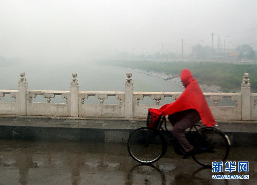 一名男子骑车经过烟雨朦胧的京杭大运河北京段(2004年8月25日摄)。