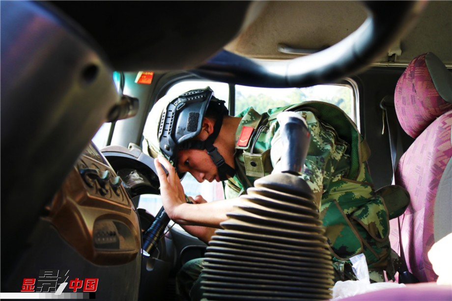 边防官兵对货车驾驶室进行检查。新华网 罗春明摄