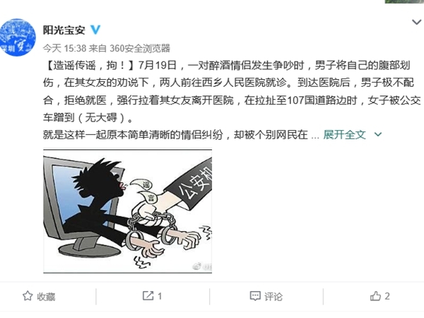 原本简单清晰的情侣纠纷,却被在微博、微信朋友圈谣传为砍人事件。宝安警方发现网络谣传后立即行动,于20日凌晨1时许,在流塘新村一带将造谣传谣的违法行为人马某(女)、唐某伟(女)、杨某芬(女)抓获。经询问,该三名女子对其在微信、微博散布砍人谣言的违法事实供认不讳。