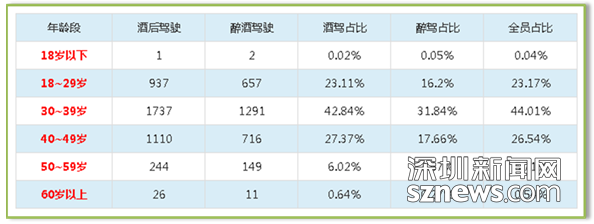根据查处的酒驾人员统计,30至39岁年龄段驾驶员酒驾高发,30-39岁的年龄段的驾驶员占44.01%,40-49岁的占26.54%,18至29岁的占23.17%。