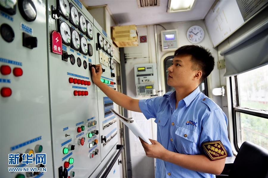 7月19日,天津至广州的T253次列车空调发电车乘务员对发电车机组运行情况进行监测。新华社发(杨宝森 摄)
