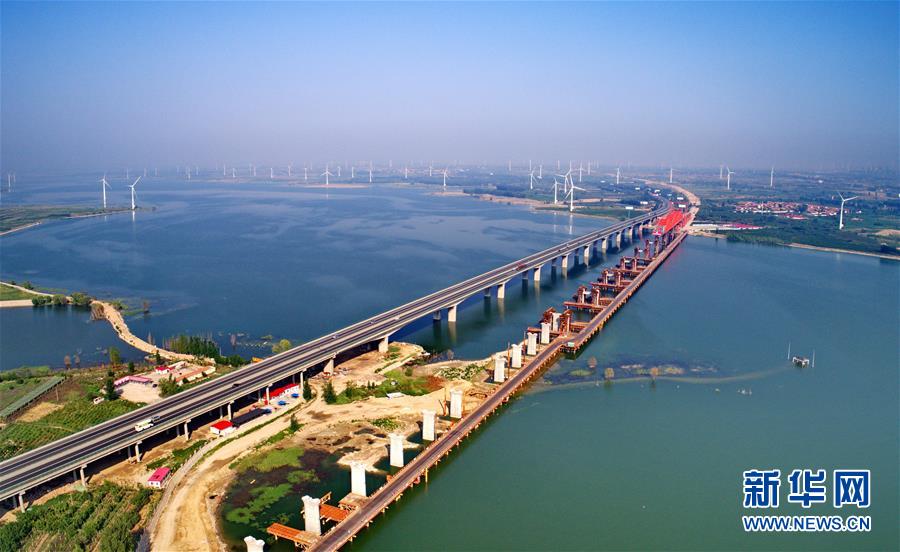 建设中的京张高铁工程官厅水库特大桥(6月27日摄)。